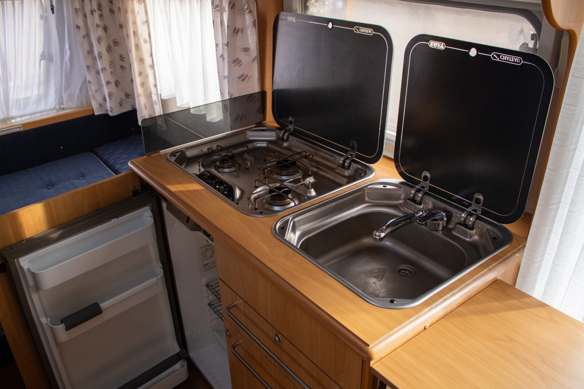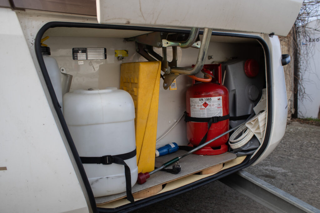 Chladnička, Kuchynský kútik, Kúpeľňa, Postele, Predstan, Stôl + stoličky, Toaleta, Varná doska