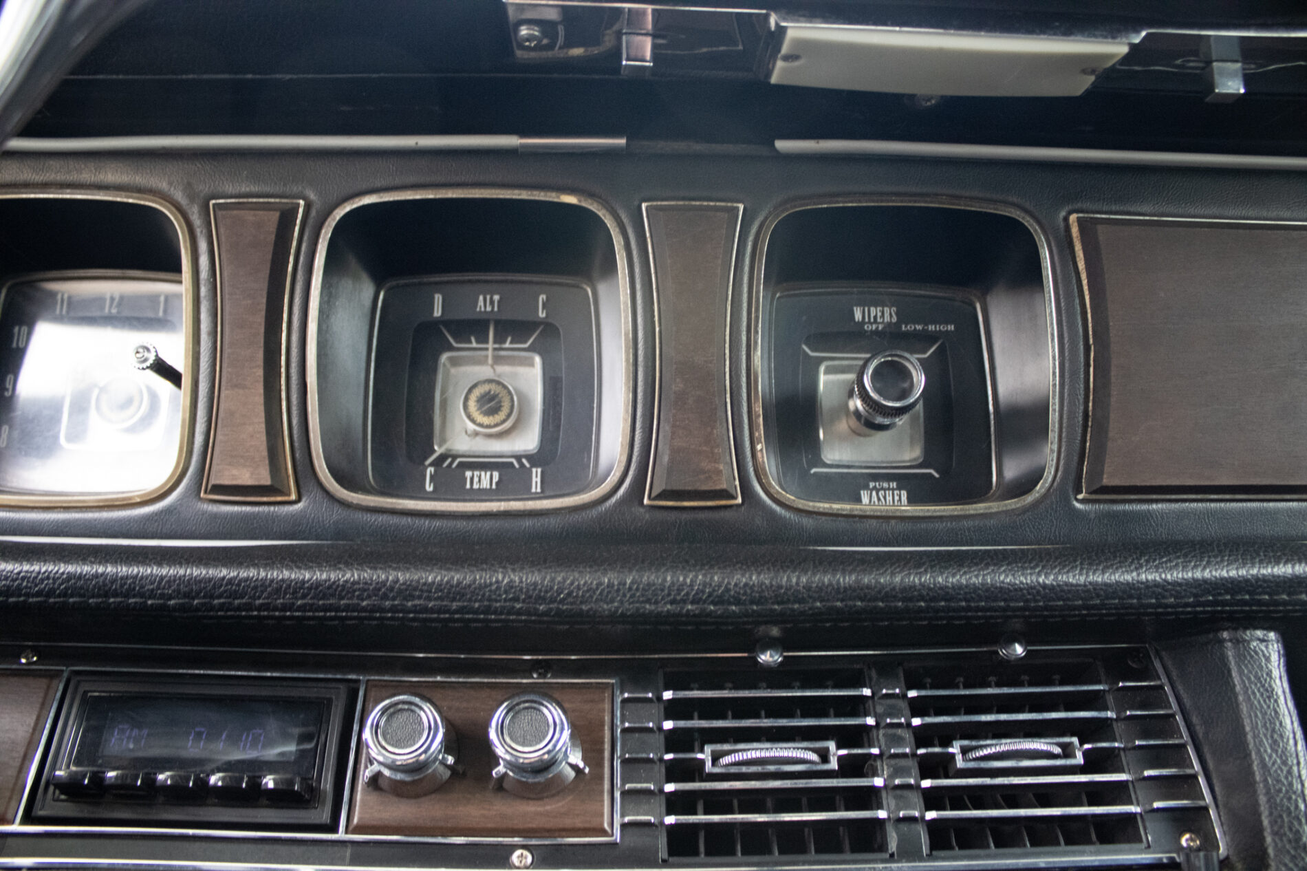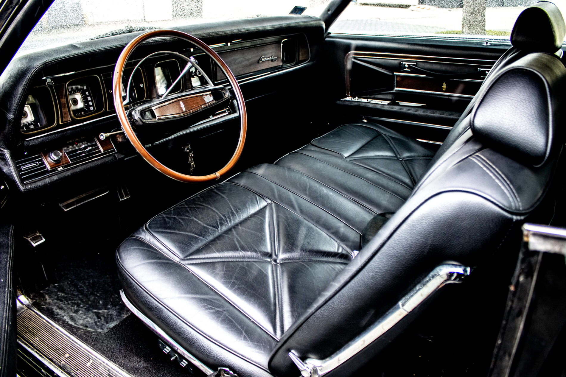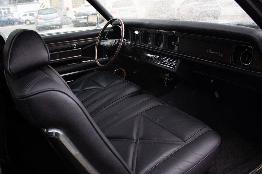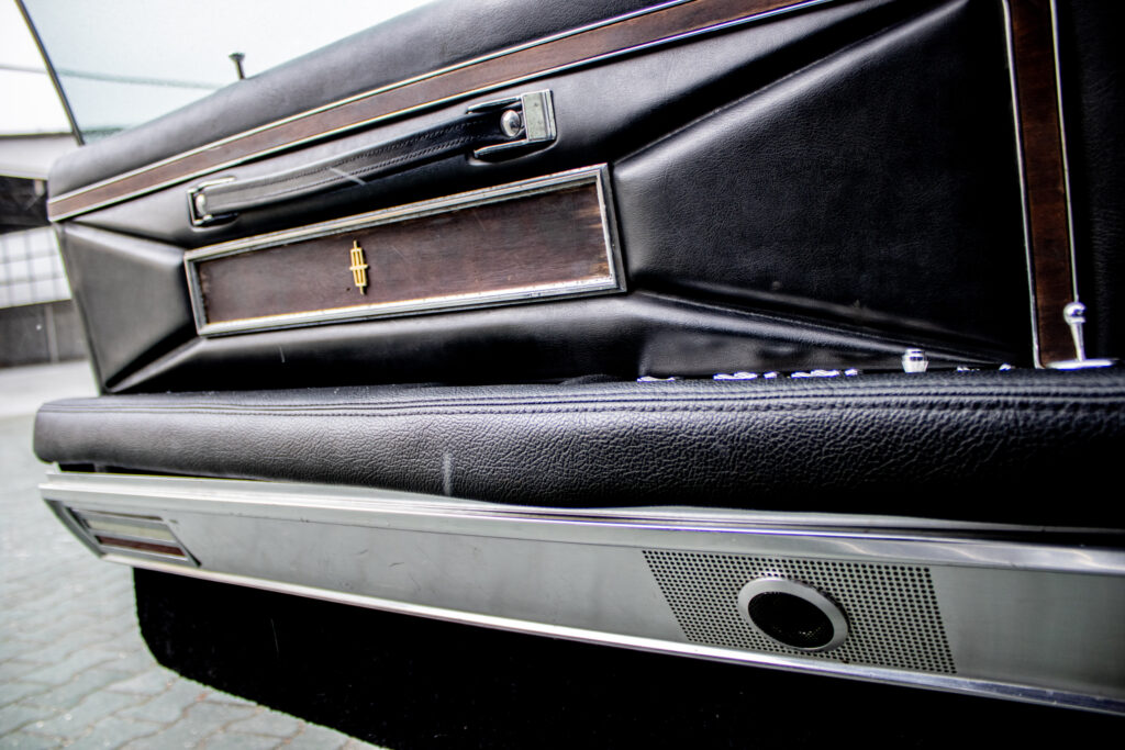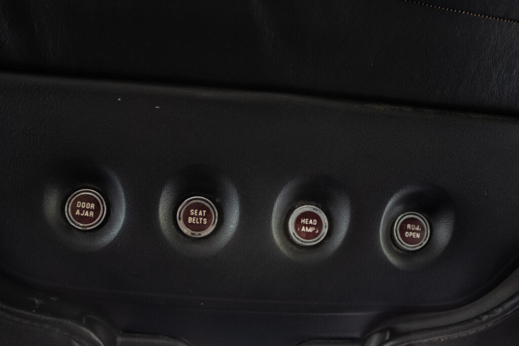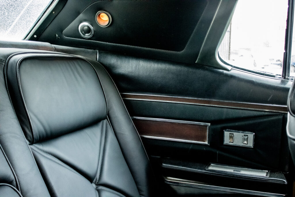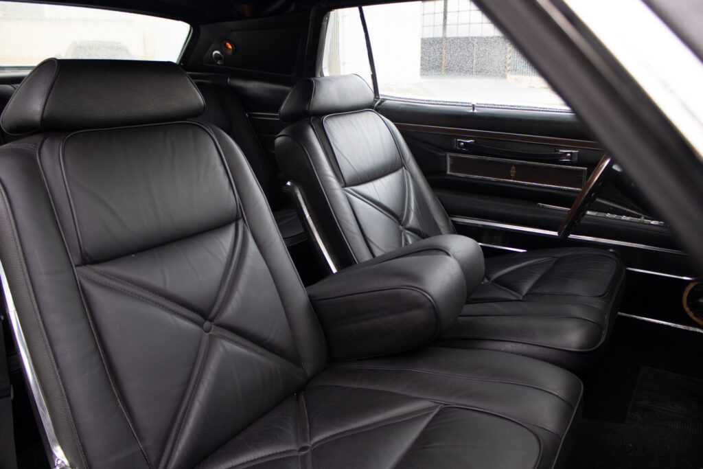 Tempomat (Speed Control) – ovládaný priamo na volante. Automatická klimatizácia (Select-Aire) – funkčný systém, ktorý vtedy stál majland. Elektricky nastaviteľné predné sedadlá (v 6 smeroch). Elektrické ovládanie všetkých okien. Posilňovač riadenia a posilňovač bŕzd (auto sa ovláda jedným prstom). Skryté predné svetlomety (vákuovo ovládané – ikonický prvok). Interiér v pravej koži s dekorom z pravého dreva (anglický dub/palisander). Cartier hodiny – v palubnej doske sú značkové hodiny od Cartier (veľký detail pre zberateľov!). Vinylová strecha v top stave (vtedy vrchol elegancie). Cornering Lights – prisvetľovanie do zákrut pri zapnutí smerovky. Originálne rádio (prípadne s elektrickou anténou).